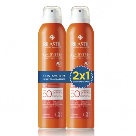 Rilastil Sun System Spray Transparente SPF50+ es el spray fotoprotector WET-SKIN de pulverización continua y multi-posición 360.