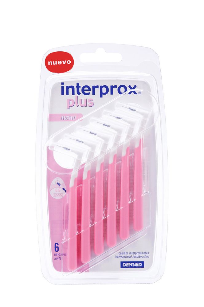 Interprox Plus ha sido diseñado para eliminar el biofilm oral (placa bacteriana) acumulado en los espacios interproximales concretamente de la zona premolar o molar. Interprox Plus Cónico espacios interproximales de 1,3 mmInterprox Plus Nano espacios interproximales de 0,6 mmInterprox Plus Micro espacios interproximales de 0,9 mmInterprox Plus Super Micro espacios interproximales de 0,7 mm Su cabezal en ángulo facilita el acceso a los espacios interdentales en la zona de los premolares o molares. Este diseño específico permite una entrada perpendicular, evitando causar heridas en las encías. Las dimensiones del cabezal y su forma cónica garantizan una limpieza profunda en espacios interdentales La innovadora fabricación con filamentos de Tynex de alta calidad ofrece un mayor cuidado de las encías, ya que su diseño a doble color permite que los filamentos blancos detecten los puntos de sangrado y que los negros revelen la presencia de biofilm oral. El alambre, de acero inoxidable, está recubierto de Poliuretano (material plástico), para proteger mejor las estructuras mucosas, dentarias e implantes. El cepillo, además, posee un capuchón protector que permite transportarlo cómodamente. Interprox Plus limpia eficazmente los espacios interproximales y ayuda a proteger los dientes de las caries y enfermedades periodontales. Interprox cumple la normativa ISO 16409 (norma internacional para cepillos interdentales).